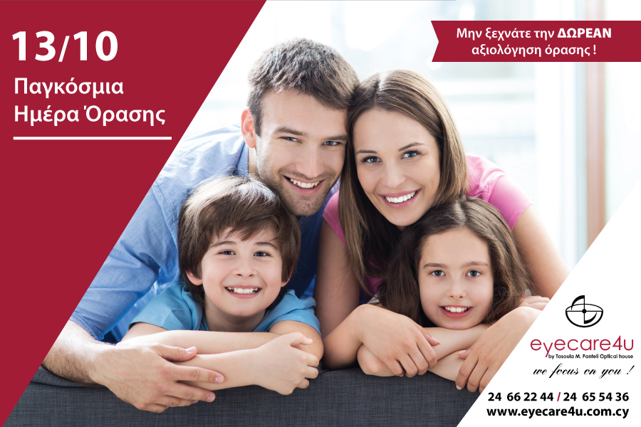 Ο οπτικός οίκος Eye Care 4 U by Tasoula M. Panteli παρέχει στους πολίτες την ευκαιρία για προβληματισμό, ενημέρωση, ευαισθητοποίηση και δράση στα πλαίσια της Παγκόσμιας Ημέρας Όρασης και προτρέπει το κοινό να μην αγνοεί οποιαδήποτε συμπτώματα μείωσης οπτικής οξύτητας και προσφέρει οφθαλμομετρήσεις από έμπειρους οπτικούς.