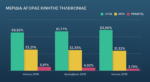 Σύμφωνα με στοιχεία του Γραφείου Επιτρόπου Ρυθμίσεως Ηλεκτρονικών Επικοινωνιών και Ταχυδρομείων (ΓΕΡΗΕΤ) για την παρακολούθησης της αγοράς κινητής τηλεφωνίας, το μερίδιο αγοράς της Cyta τον Ιούνιο του 2016 υποχώρησε για πρώτη φορά κάτω από το 60%, φτάνοντας στο 59,92% σε σχέση με 61,77% τον Δεκέμβριο του 2015 και 63,85% τον Ιούνιο του 2015, με τη μείωση να πλησιάζει το 4% σε ετήσια βάση.