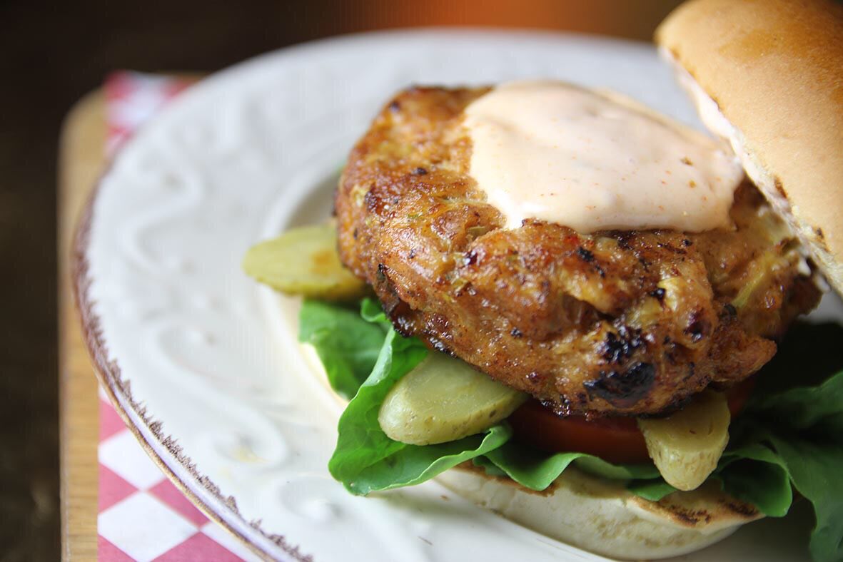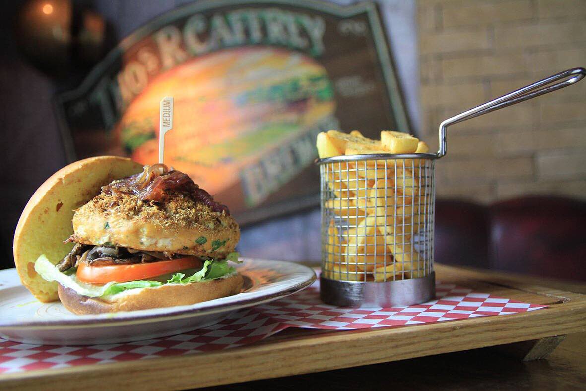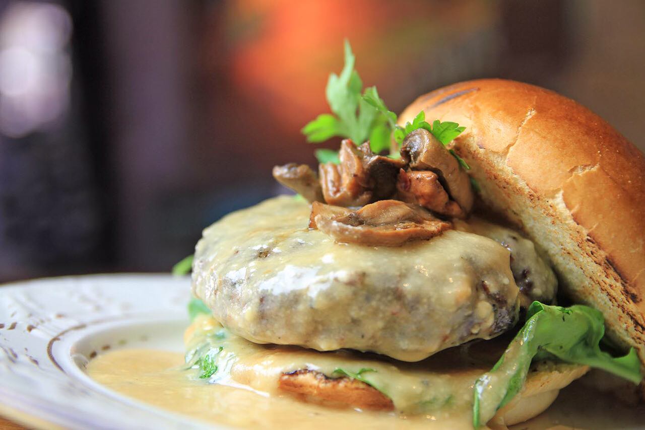 Μπέργκερ απο κοτόπουλο με κρούστα τυριών, μανιταράκια quason, γλυκιά μουστάρδα και μαρμελάδα κόκκινων κρεμμυδιών.