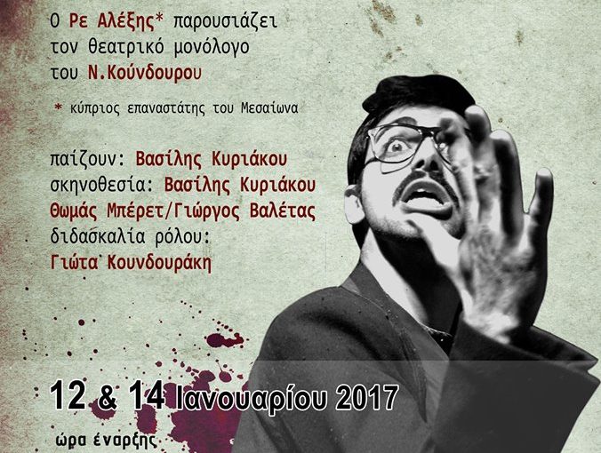 H θεατρική ομάδα ΡΕ ΑΛΕΞΗΣ παρουσιάζει για πρώτη φορά τον μονόλογο του Νίκου Κούνδουρου στη Λάρνακα και πιο συγκεκριμένα στο Πολυχώρο Αποθήκες στις 12/1/2017 και 14/1/2017 η ώρα 21:00. Επίσης στις 11/1/2017 θα διεξαχθεί η παρουσίαση του βιβλίου ‘Η απολογία του Θεόφιλου Τσάφου’ του από την Θεατρολόγο Χρυστάλλα Καλλένου η ώρα 20:00.