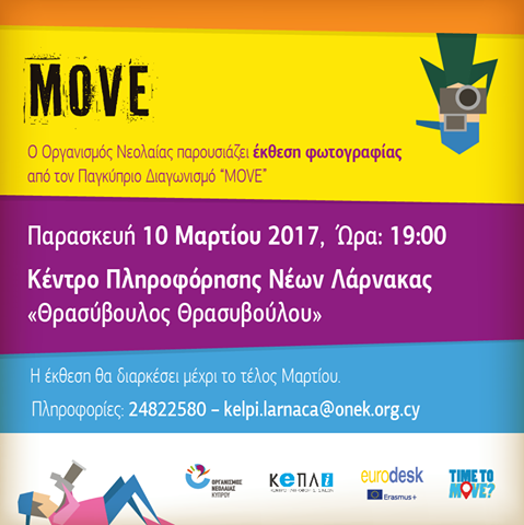 Την Παρασκευή 10 Μαρτίου η έκθεση φωτογραφίας με τίτλο «Move – Motivating Others through Voices of Experience»που διοργανώνεται από τον Οργανισμό Νεολαίας Κύπρου, θα πραγματοποιήσει τα εγκαίνια στο Κέντρο Πληροφόρησης Νέων «Θρασύβουλος Θρασυβούλου» (Γρηγόρη Αυξεντίου 27, Πλατεία Ακροπόλεως Λάρνακα).