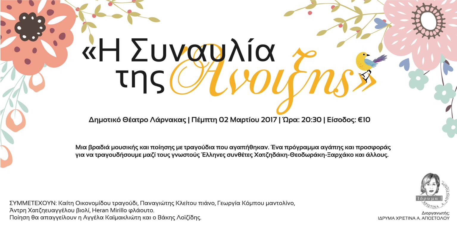 “Η Συναυλία της Άνοιξης” Δημοτικό Θέατρο Λάρνακας Πέμπτη 02 Μαρτίου 2017 Ώρα 20:30 Είσοδος: €10.