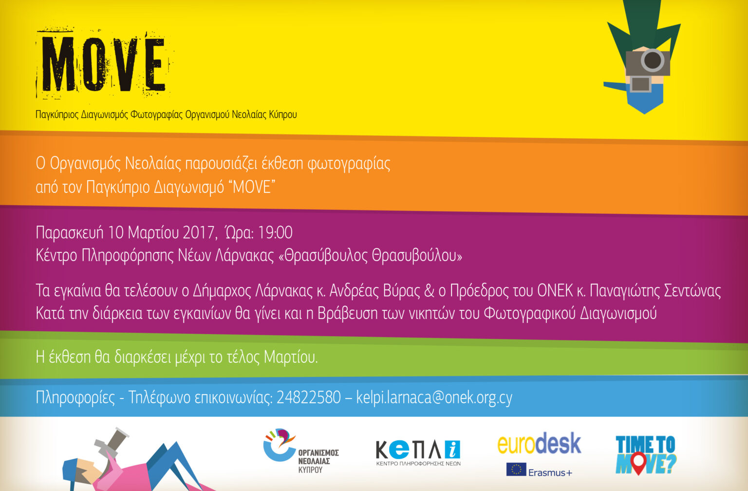 Τίτλος της Έκθεσης είναι «Move – Motivating Others through Voices of Experience» και σε αυτή θα παρουσιαστούν φωτογραφίες που βραβεύτηκαν αλλά και διακρίθηκαν στον διαγωνισμό φωτογραφίας που διεξάχθηκε από τις 15 Μαρτίου μέχρι 15 Νοεμβρίου 2016, και που έγινε εις μνήμη του Θρασύβουλου Θρασυβούλου, τέως Εκτελεστικού Γραμματέα του Οργανισμού Νεολαίας. Η συμμετοχή και η ανταπόκριση των νέων στο διαγωνισμό ήταν αθρόα και υποβλήθηκαν περισσότερες από 470 συνολικά φωτογραφίες οι οποίες αντικατοπτρίζουν τις σκέψεις, τα συναισθήματα, τις ιδέες και την αντίληψη της σημερινής πραγματικότητας από τους νέους της Κύπρου.