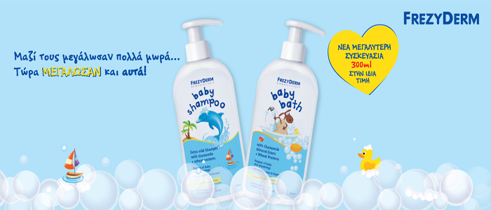 Τα Baby Shampoo & Baby Bath της FREZYDERM έχουν μεγαλώσει, πολλά μωρά.. Τώρα μεγάλωσαν κι αυτά και έρχονται σε ανανεωμένη και μεγαλύτερη συσκευασία 300ml προσφέροντας 50% επιπλέον προϊόν στην ίδια τιμή!
