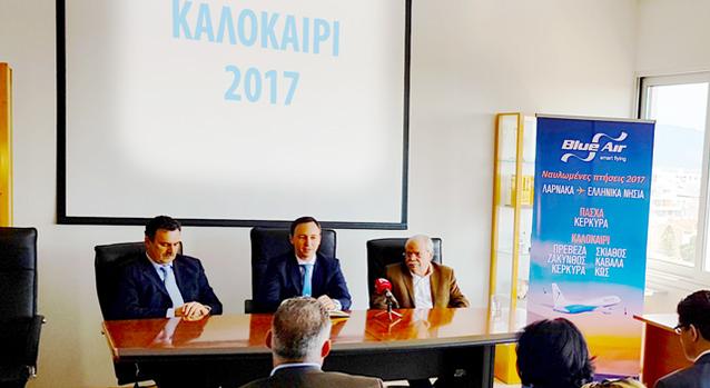 Η αεροπορική εταιρεία  Blue Air δραστηριοποιείται στην Κύπρο από το 2008, με πτήσεις από και προς την Αθήνα και την Θεσσαλονίκη, το Βουκουρέστι και το Λονδίνο (Λούτον), το Μπέρμιγχαμ από 26 Μαρτίου 2017, το Κλουζ-Ναπόκα (Τρανσυλβανία) από 9 Απριλίου 2017 και το Λίβερπουλ από 16 Ιουνίου 2017.