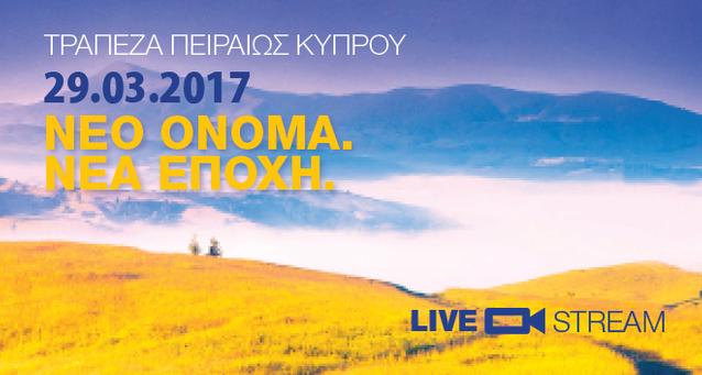 Νέα εποχή για την Τράπεζα Πειραιώς Κύπρου σηματοδοτεί η 29η Μαρτίου, όπου σε εκδήλωση στη Λευκωσία πραγματοποιείται η αποκάλυψη του νέου ονόματος της Τράπεζας. Η όλη εκδήλωση θα μεταδίδεται σε απευθείας μετάδοση από το InBusinessNews.com στις 19:30.