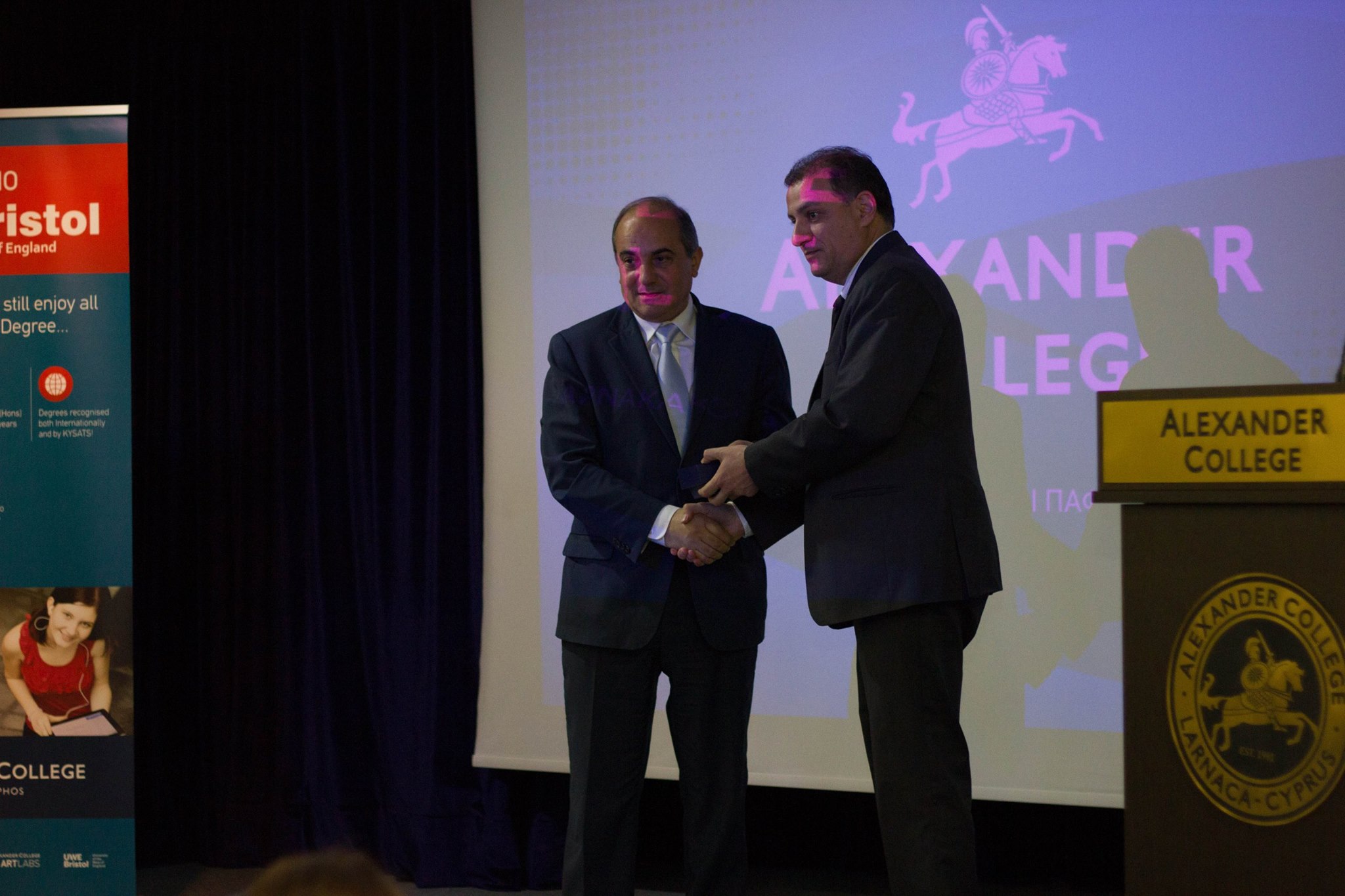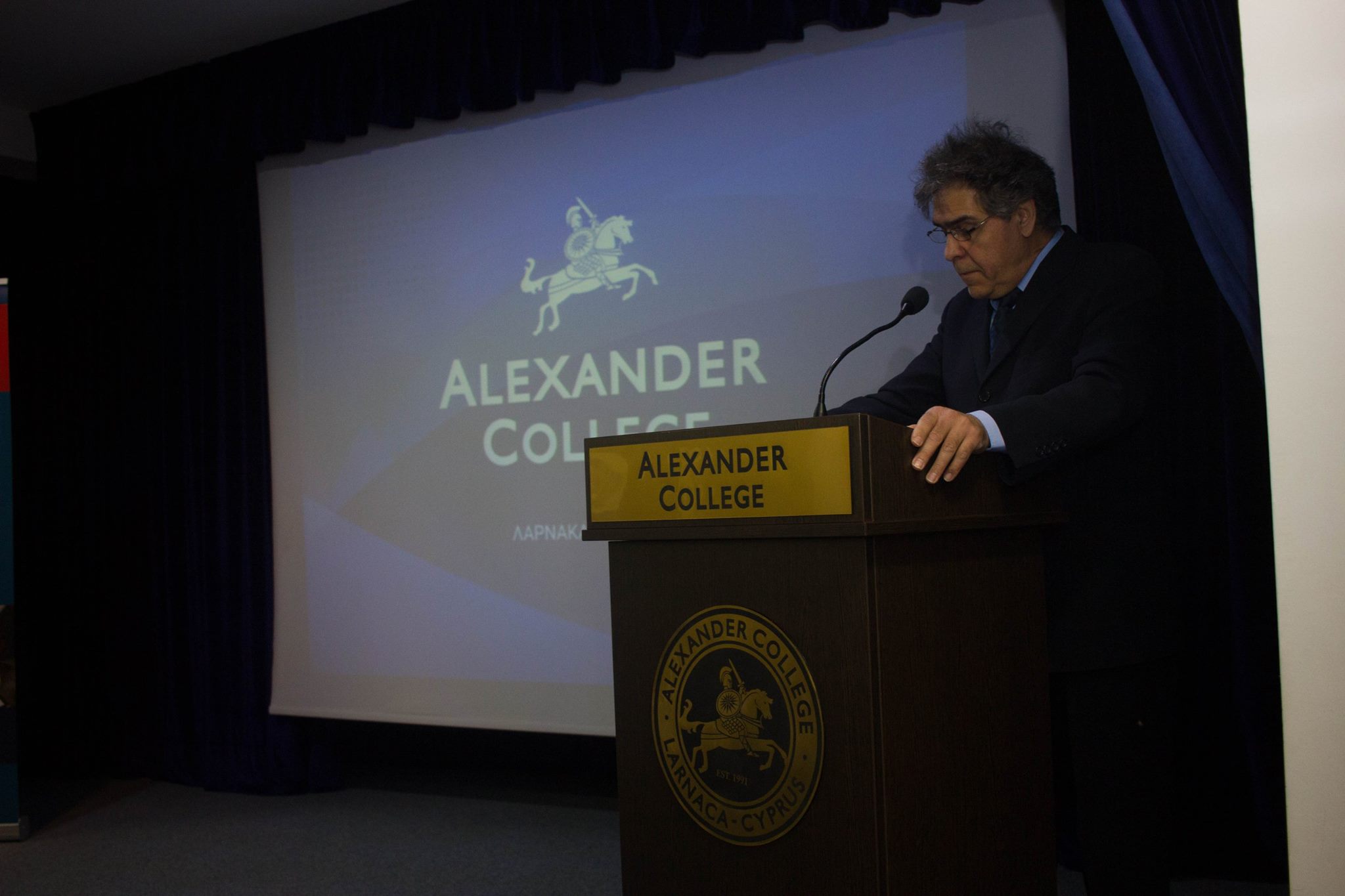 Το βήμα φιλοξένησε επίσης, το Δημάρχο Λάρνακας κ. Ανδρέα Βύρα και Αραδίππου κ. Ευάγγελο Ευαγγελίδη. Ο κ. Βύρας τόνισε ότι «το Alexander College αποτελεί ένα Εκπαιδευτικό Ίδρυμα της χώρας μας, το οποίο, με το κύρος και την αξιοπιστία του, έχει εδραιωθεί σε τοπικό, ευρωπαϊκό και διεθνές επίπεδο και έχει να επιδείξει ποιοτικό έργο, τόσο σε θέματα εκπαίδευσης, όσο και σε θέματα έρευνας, καθώς και κοινωνικής προσφοράς.»