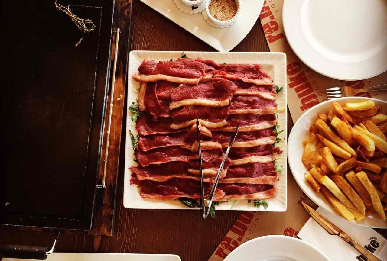 Το απολαυστικό αυτό έδεσμα σερβίρεται με τηγανητές πατάτες, 3 dips και 20 κομμάτια μοσχαρίσου κρέατος για 2 ατόμα. Το όμορφο γευστικό ταξίδι ολοκληρώνεται με το ψήσιμο του κρέατος από τον πελάτη στην πλάκα ψησίματος.