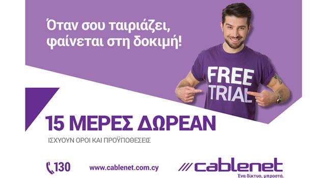 Η νέα διαφημιστική εκστρατεία της Cablenet, FREE TRIAL για 15 μέρες με το σλόγκαν “Όταν κάτι σου ταιριάζει φαίνεται στη δοκιμή”, καλεί τον κόσμο να ζήσει τη μοναδική μωβ εμπειρία από το πιο γρήγορο, ανεξάρτητο δίκτυο στην Κύπρο.