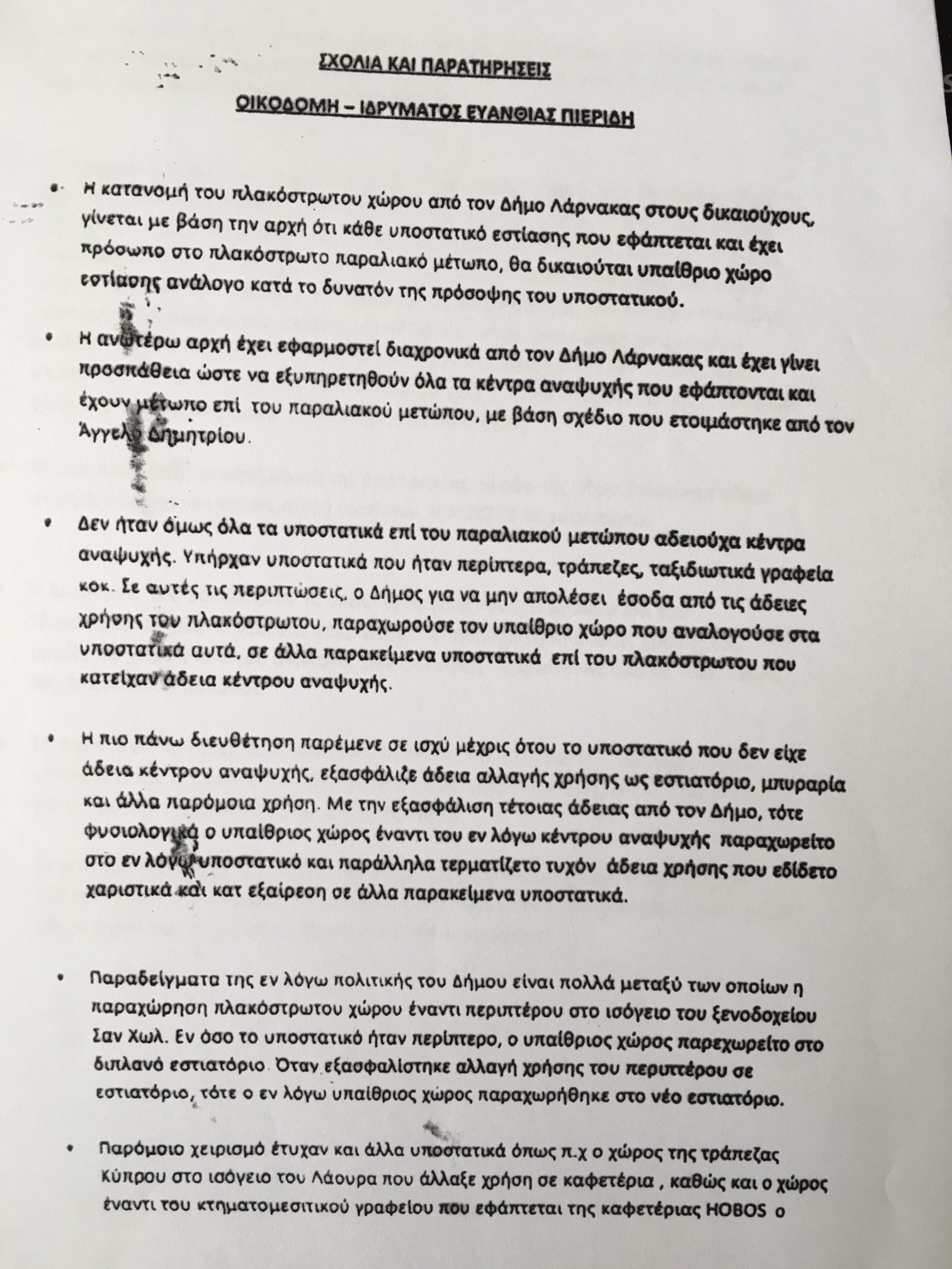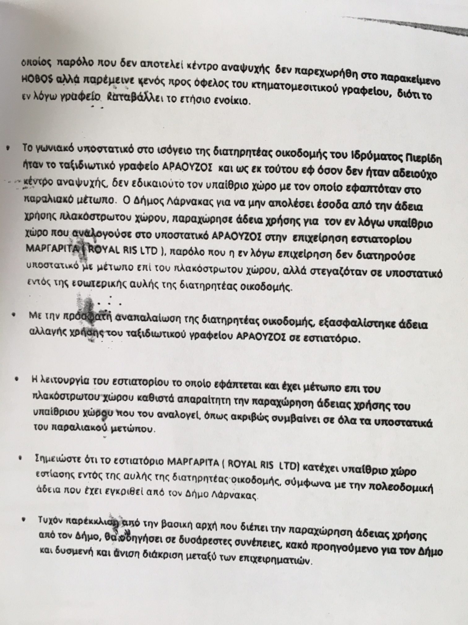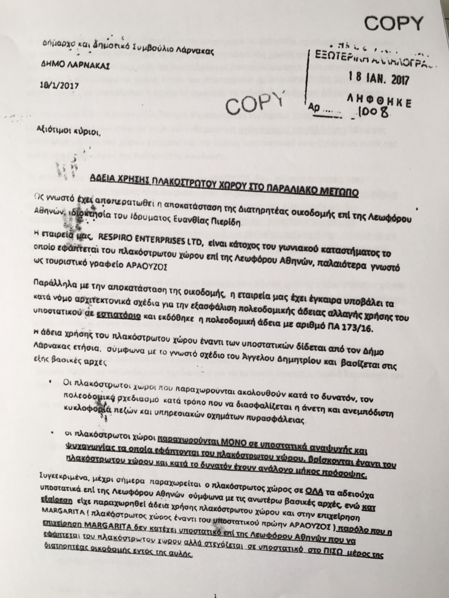 Το City of Larnaka.com έχει στην κατοχή του την επιστολή που είχε σταλεί από την εταιρεία Respiro Enterprises LTD στο Δημοτικό Συμβούλιο τον Ιανουάριο του 2017, μέσα από την οποία διαφαίνεται πως με τις διάφορες αναρτήσεις στα κοινωνικά δίκτυα η κοινή γνώμη παραπλανήθηκε.