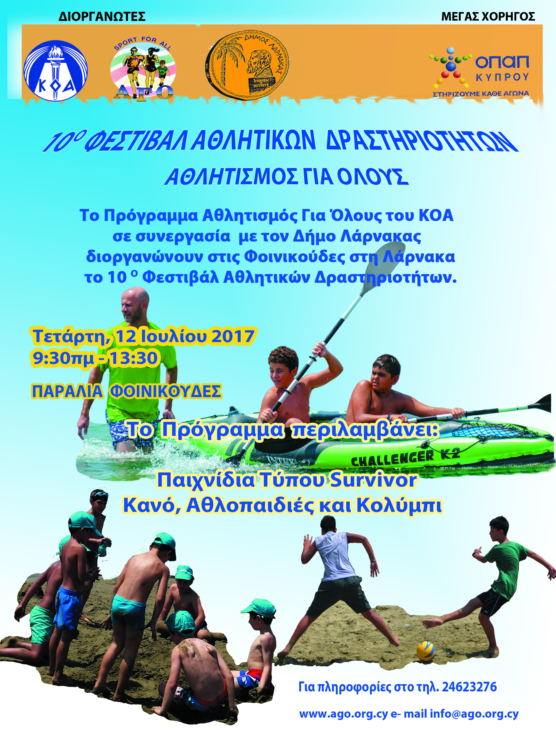 Το Πρόγραμμα «Αθλητισμός Για Όλους» του Κυπριακού Οργανισμού Αθλητισμού σε συνεργασία με τον Δήμο Λάρνακας διοργανώνει το 10ο Φεστιβάλ Καλοκαιρινών Αθλητικών Δραστηριοτήτων.