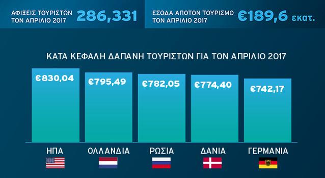 Αυξημένα παρουσιάζονται τα έσοδα από τον τουρισμό κατά τον μήνα Απρίλιο 2017 λόγω και των αυξημένων αφίξεων που καταγράφηκαν από την έναρξη της φετινής τουριστικής περιόδου.