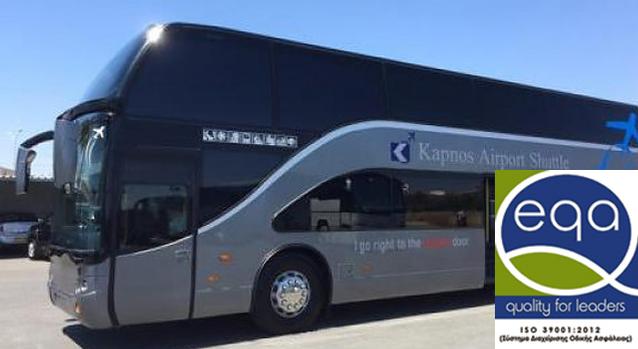 Η εταιρεία Kapnos Airport Shuttle εξασφάλισε πρόσφατα το Πρότυπο Διαχείρισης Οδικής Ασφάλειας ISO 39001:2012. Το συγκεκριμένο πρότυπο παραχωρείται μετά από αυστηρό έλεγχο σε εταιρείες που ανταποκρίνονται στις υψηλές απαιτήσεις σχεδιασμού και στην εφαρμογή Συστήματος Διαχείρισης της Οδικής Ασφάλειας. Πρόκειται ουσιαστικά για ένα εργαλείο με σκοπό την πρόληψη της εμφάνισης δυσάρεστων οδικών συμβάντων και τη μείωση της βαρύτητας των συνεπειών τους, μέσα από ένα δομημένο πλαίσιο πολιτικής οδικής ασφάλειας.