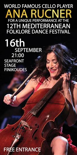 Την έναρξη του καλλιτεχνικού προγράμματος του φετινού Φεστιβάλ, το Σάββατο 16/9/2017, στις 8.30 μ.μ., θα κάνει η παγκοσμίου φήμης τσελίστρια  ANA RUCNER από τη Κροατία, η οποία θα μας μαγέψει με το τσέλο της.  Μελωδίες από την κροατική παράδοση και τραγούδια θα είναι στο ρεπερτόριο της αφού θα εκπροσωπήσει τη χωρά της Κροατία.