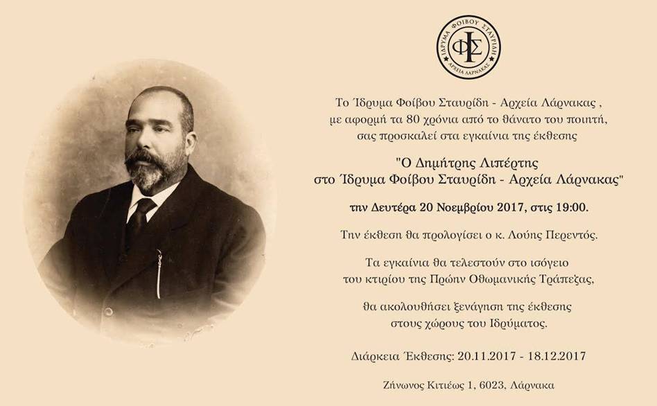 Το ίδρυμα Φοίβου Σταυρίδη – Αρχεία Λάρνακας, με αφορμή τα 80 χρόνια από το θάνατο του ποιητή σας προσκαλεί στα εγκαίνια της έκθεσης  ” Ο Δημήτρης Λιπέρτης  ίδρυμα Φοίβου Σταυρίδη – Αρχεία Λάρνακας ” την Δευτέρα 20 Νοεμβρίου ώρα 19:00 μ.μ στο κτήριο της πρώην Οθωμανικής Τράπεζας.