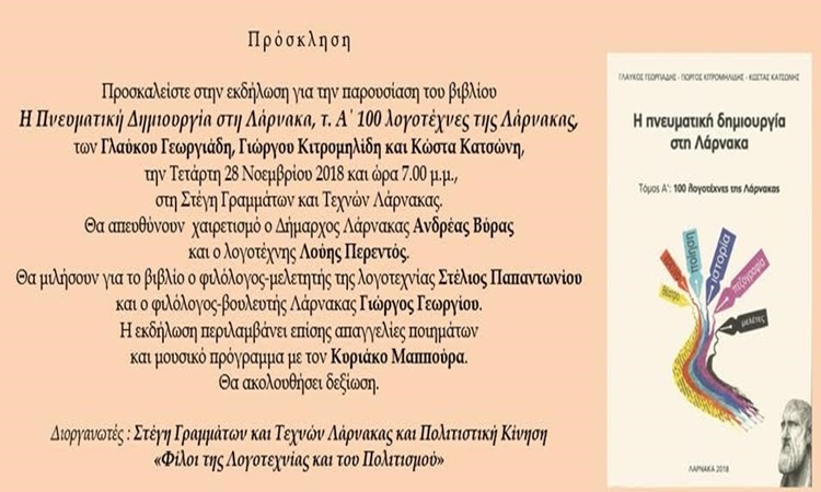 Την Τετάρτη, 28 Νοεμβρίου 2018 και ώρα 7.00 μ.μ., η Στέγη Γραμμάτων και Τεχνών και η Πολιτιστική Κίνηση Λάρνακας «Φίλοι της Λογοτεχνίας και του Πολιτισμού», διοργανώνουν εκδήλωση για την παρουσίαση του βιβλίου «Η πνευματική δημιουργία στη Λάρνακα-100 λογοτέχνες της Λάρνακας (τόμος α΄)», που έγραψαν οι Γλαύκος Γεωργιάδης, Γιώργος Κιτρομηλίδης και Κώστας Κατσώνης.