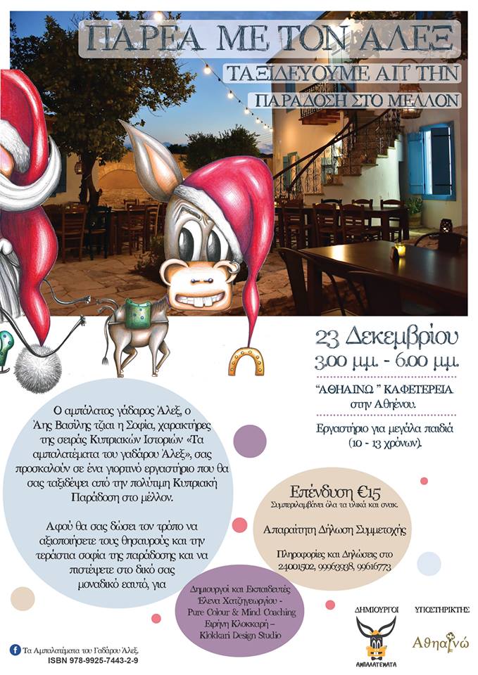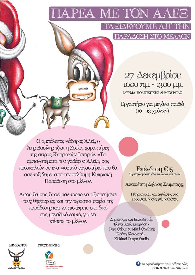 Ο αμπάλατος γάδαρος Άλεξ, ο Άης Βασίλης τζιαι η Σοφία, χαρακτήρες της σειράς Κυπριακών Ιστοριών «Τα αμπαλατέματα του γαδάρου Άλεξ», σας προσκαλούν σε ένα γιορτινό εργαστήριο που θα σας ταξιδέψει από την πολύτιμη Κυπριακή Παράδοση στο μέλλον.