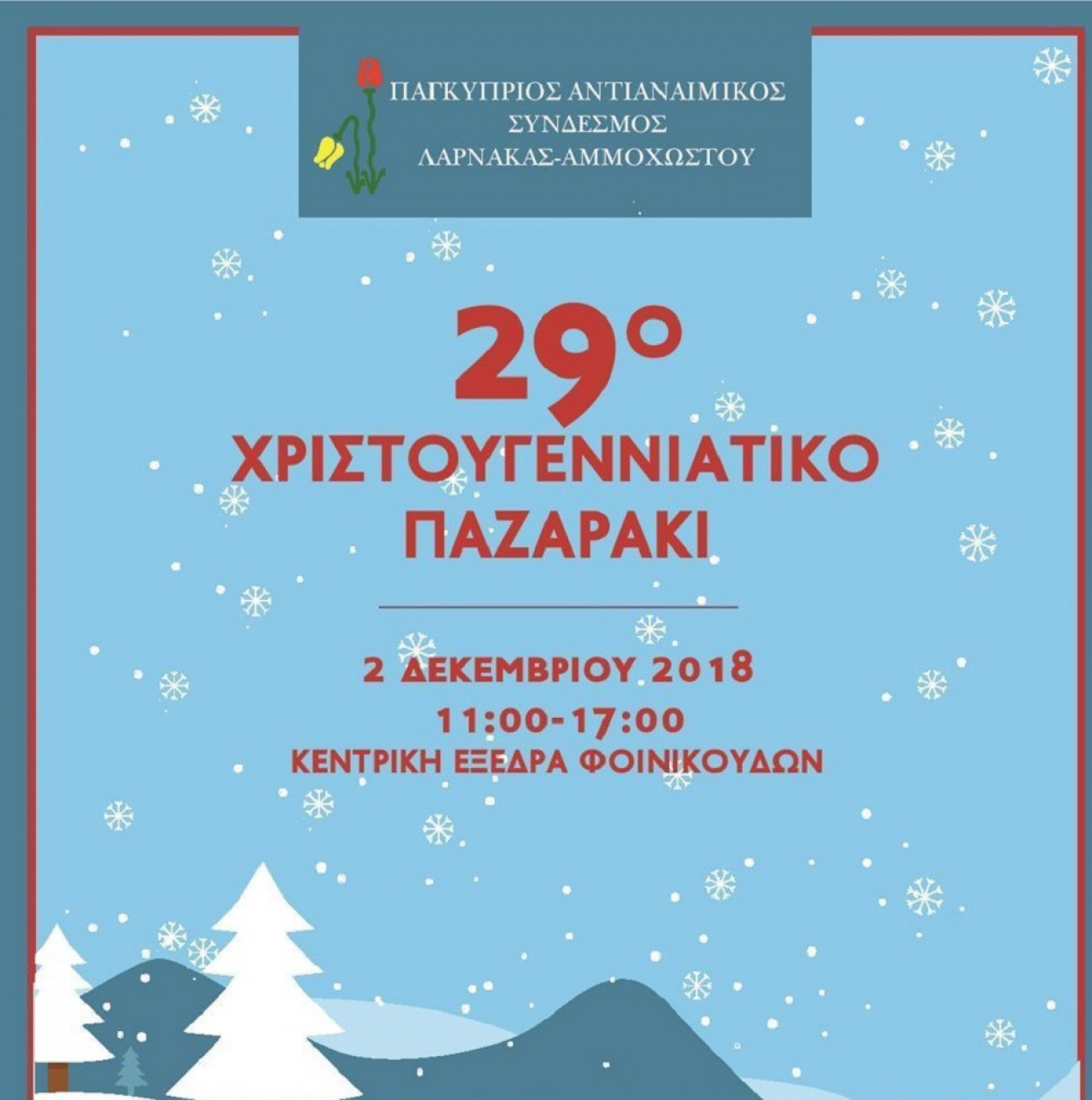 Ο Παγκύπριος Αντιαναιμικός Σύνδεσμος Λάρνακας-Αμμοχώστου, μέσα στο πλαίσιο της ενημερωτικής του δράσης αλλά και της οικονομικής ενίσχυσής του, διοργανώνει και φέτος το 29ο Χριστουγεννιάτικο παζαράκι, την Κυριακή, 2 Δεκεμβρίου 2018, από τις 11:00π.μ. μέχρι τις 5:00μ.μ. στη Λεωφόρο Αθηνών, στην Κεντρική Εξέδρα στις Φοινικούδες.