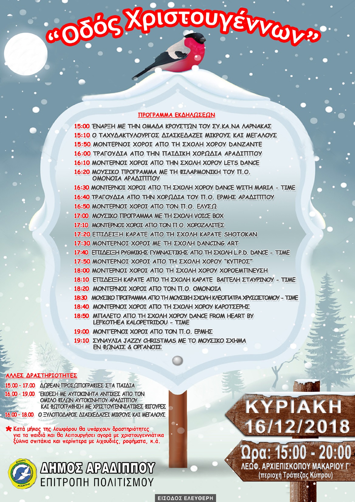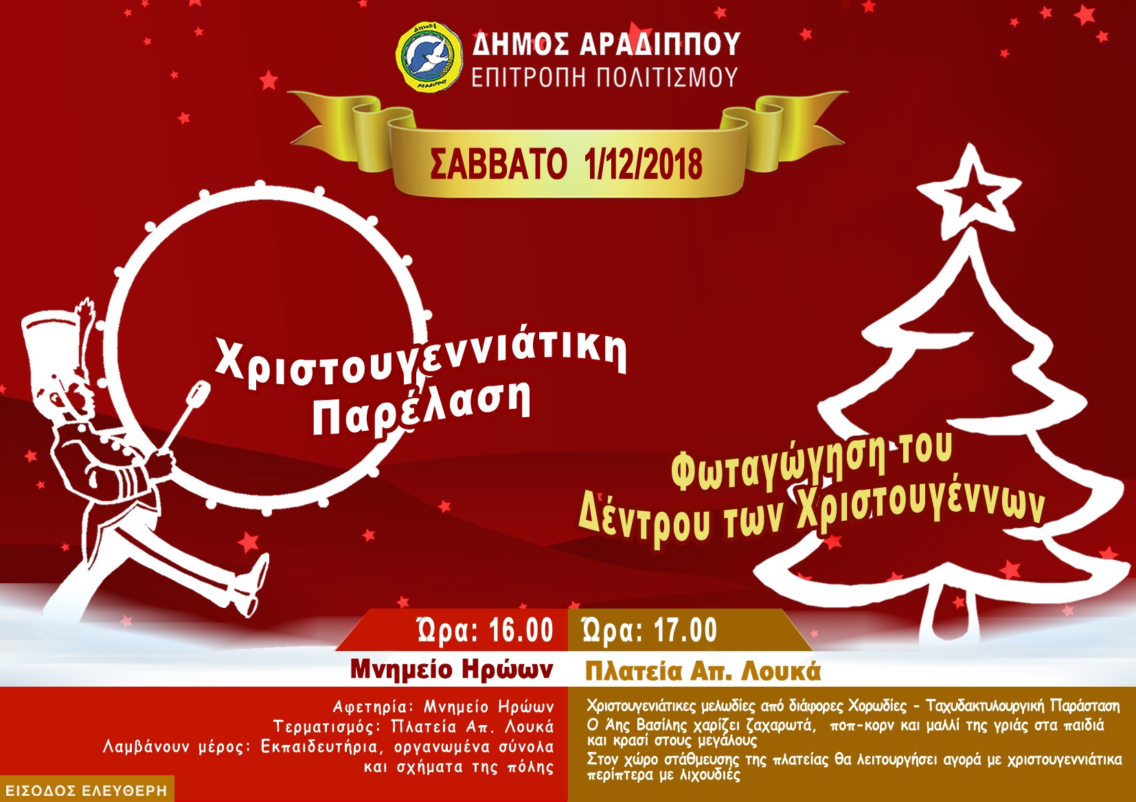 Στο πνεύμα των Χριστουγεννιάτικων Ημερών η Αραδίππου γιορτάζει και αλλάζει ρυθμούς, διάθεση και χρώμα. Ο κύκλος των εορταστικών εκδηλώσεων ανοίγει επίσημα το Σάββατο 1η Δεκεμβρίου 2018 και ώρα 16.00 με μια χριστουγεννιάτικη παρέλαση. Η παρέλαση στην οποία συμμετέχουν οργανωμένα σύνολα και σχήματα της πόλης θα ξεκινήσει από το Μνημείο Ηρώων και αφού διασχίσει τη λεωφόρο Αρχιεπισκόπου Μακαρίου θα καταλήξει στην πλατεία Αποστόλου Λουκά. Εκεί γύρω στις 17.00 θα πραγματοποιηθεί η φωταγώγηση του Χριστουγεννιάτικου Δέντρου από τον Δήμαρχο Αραδίππου, κ. Ευάγγελο Ευαγγελίδη. Στη συνέχεια θα ακολουθήσουν χριστουγεννιάτικα τραγούδια από διάφορα μουσικά σύνολα και ταχυδακτυλουργική παράσταση. Στην πλατεία θα βρίσκεται ο ΄Αη Βασίλης ο οποίος θα χαρίζει γλυκά στα παιδιά, ποπ- κορν και μαλλί της γριάς, ενώ στον ίδιο χώρο θα προσφέρεται κρασί στους μεγάλους. Την ίδια στιγμή στον χώρο στάθμευσης της πλατείας θα λειτουργήσει αγορά με χριστουγεννιάτικα ξύλινα σπιτάκια με λιχουδιές, ροφήματα κ.ά., ενώ τα παιδιά θα μπορούν να φωτογραφίζονται με τον Αη Βασίλη και το έλκηθρο του.