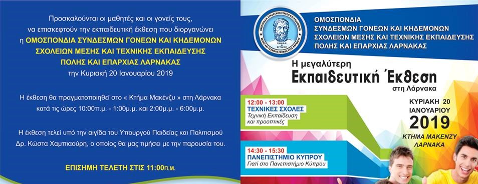 Η Ομοσπονδία Συνδέσμων Γονέων και Κηδεμόνων Σχολείων Μέσης και Τεχνικής Εκπαίδευσης Πόλης και Επαρχίας Λάρνακας διοργανώνει την μεγαλύτερη Εκπαιδευτική Έκθεση την Λάρνακα.