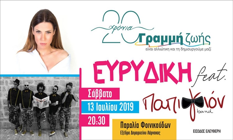 20 χρόνια «Γραμμή ζωής» με Ευρυδίκη feat. Παπιγιόν Band, το Σάββατο 13 Ιουλίου παραλία των  Φοινικούδων, στις 20:30.