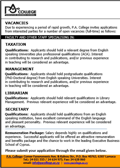 City of Larnaca > Blog > Business > Γενικά > Το P.A. College άνοιξε θέσεις εργασίας
