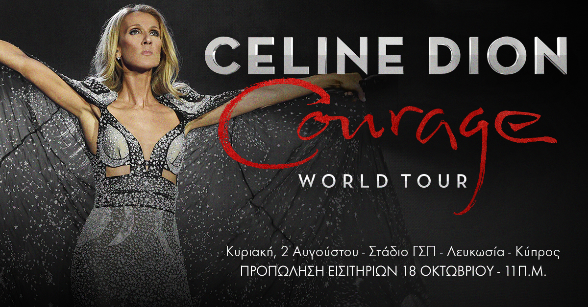 Ένα από τα πιο αναγνωρίσιμα και αξιοσέβαστα αστέρια της Pop μουσικής, η Celine Dion, ανακοινώνει επιπρόσθετες ημερομηνίες για την παγκόσμια περιοδεία της “COURAGE”, σε πόλεις της Βόρειας Αμερικής, της Ευρώπης και της Μέσης Ανατολής. Η περιοδεία που ξεκίνησε στις 18 Σεπτεμβρίου από το Κεμπέκ του Καναδά, αποτελεί την πρώτη περιοδεία της παγκοσμίου φήμης τραγουδίστριας στις ΗΠΑ μετά από 10 χρόνια, και η οποία περιλαμβάνει για πρώτη φορά εμφανίσεις σε Κύπρο και Μάλτα.