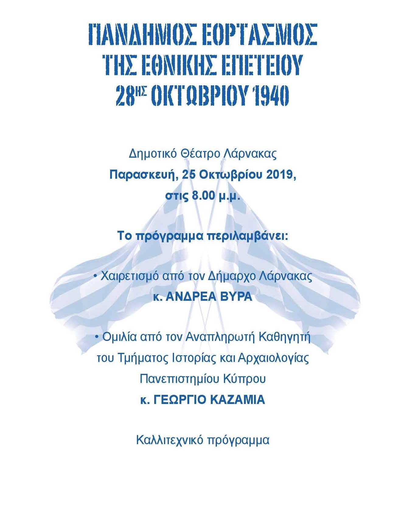 Με κάθε λαμπρότητα θα γιορτάσει και φέτος η Λάρνακα την Εθνική Επέτειο της 28ης Οκτωβρίου 1940.