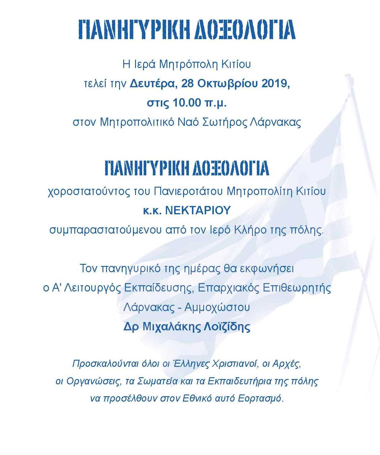 Με γενική κωδωνοκρουσία των Ιερών Ναών της πόλης, εωθινό στους δρόμους και έπαρση της σημαίας στην Πλατεία Αγάλματος Ελευθερίας από το Δήμαρχο Λάρνακας Ανδρέα Βύρα στην παρουσία των Αρχών της πόλης, θα αρχίσουν αύριο  στη Λάρνακα οι εορτασμοί για την επέτειο της 28ης Οκτωβρίου 1940.