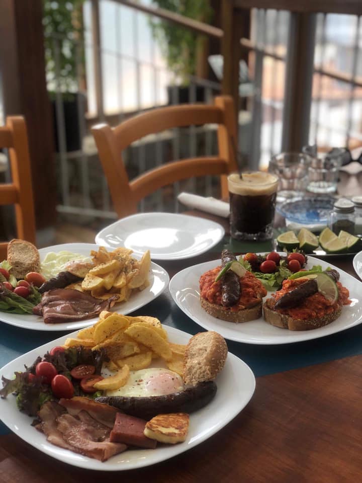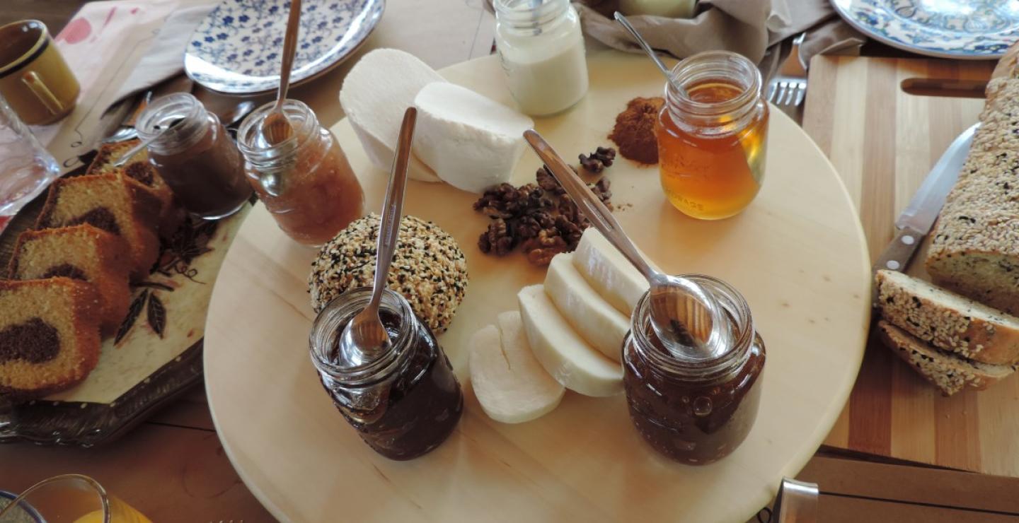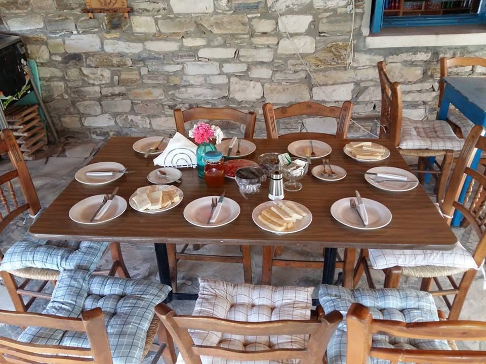 Μόλις καθίσεις σου φέρνουν ένα ποτήρι φρεσκοστυμμένο χυμό πορτοκάλι. Στη συνέχεια καταφθάνει ο ζεστός, αρωματισμένος καφές φίλτρου μαζί με μια πιατέλα που περιλαμβάνει τρεις σπιτικές μαρμελάδες εποχής που φτιάχνουν οι ίδιοι, μέλι από φίλο τους μελισσοκόμο, γλυκιά ταχίνι, κανέλα και καρύδια του χωριού, αναρή και χαλούμι από φίλο τους γαλακτοκόμο, μια μπάλα από τυρί κρέμα πασπαλισμένη με μπόλικο σουσάμι, ντομάτα και αγγουράκι από τις αυλές των σπιτιών τους.