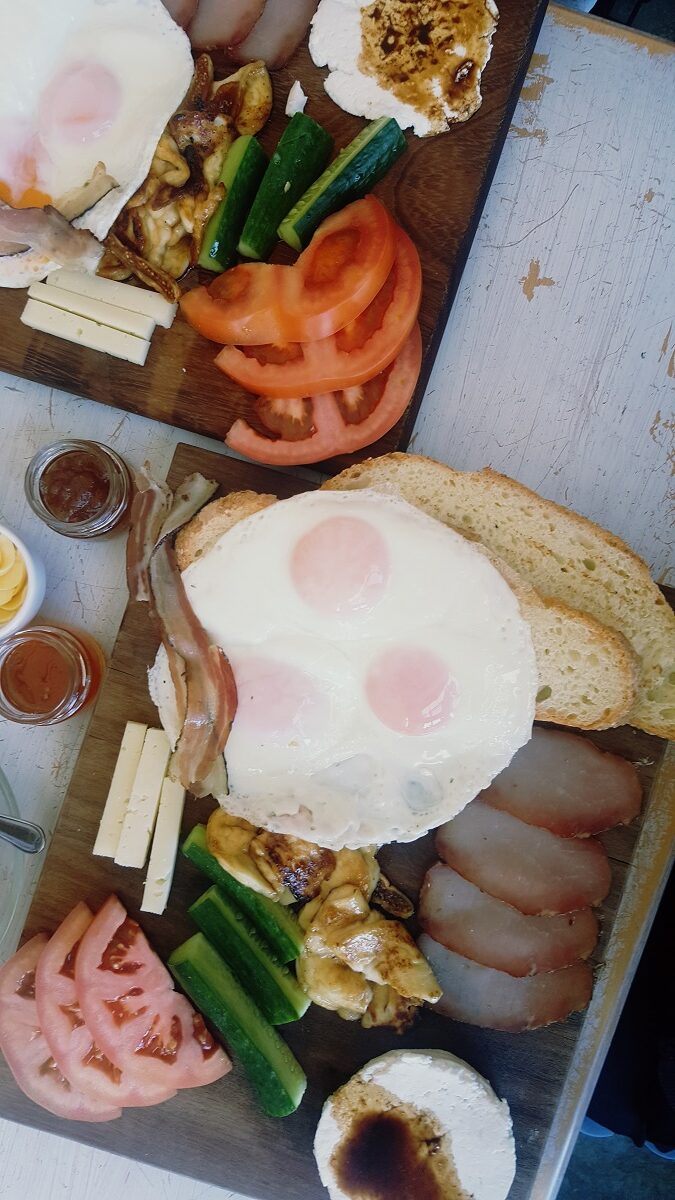 Συνοδοί σε αυτή την γευστική πανδαισία οι ζεστές φέτες γαλλικής μπαγκέτας με αρωματισμένο βούτυρο, το φρεσκοζυμωμένο κουλούρι εμπλουτισμένο με αρωματικά βότανα και κάποιο σπιτικό κέικ που φτιάχνουν οι ίδιοι, άλλοτε γεωγραφίας, άλλοτε σοκολάτας, άλλοτε λεμονιού κ.τ.λ. σερβιρισμένα πάντα με κάποια σάλτσα. Στη συνέχεια φτάνει στο τραπέζι ένα πιάτο με δύο ολόφρεσκα τηγανιτά αυγά από τα κοτέτσια του χωριού- σερβίρονται και ως ομελέτα, επίσης πατάτες, ντομάτα και πιπεριές σωτέ, μπέικον από παραγωγούς της περιοχής και γερμανικά λουκάνικα.