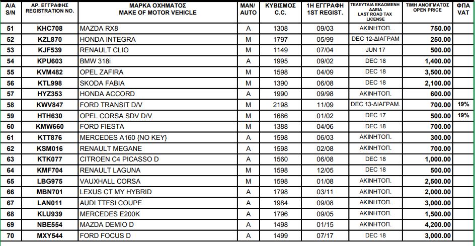 Δείτε όλο των κατάλογο των αυτοκινήτων που θα δημοπρατηθούν, τις τιμές και τις προδιαγραφές τους.