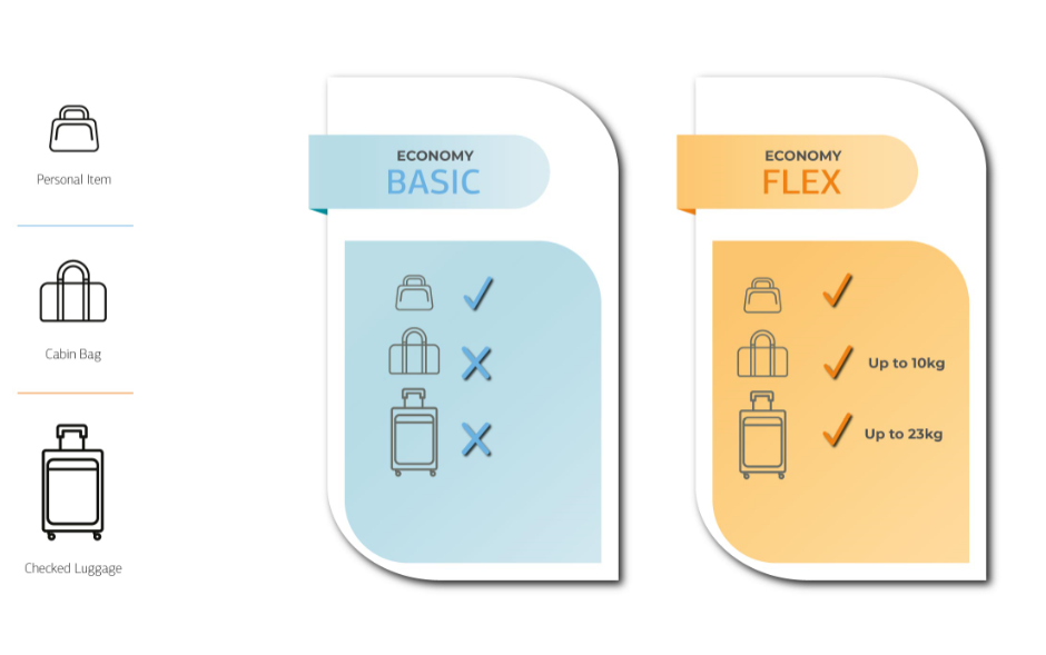 Για τους κατόχους εισιτηρίων Flex, η πολιτική αποσκευών παραμένει ως έχει, δηλ. 23 κιλά αποσκευή, 10 κιλά χειραποσκευή και ένα μικρό προσωπικό αντικείμενο.