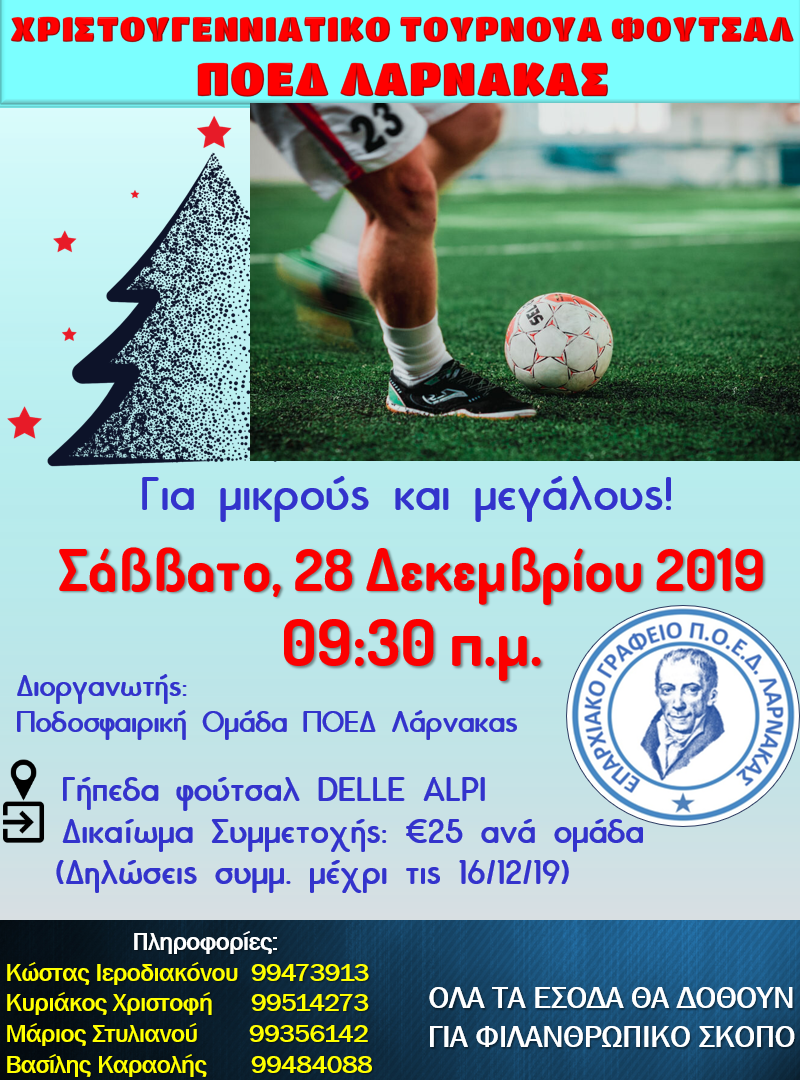 Η ποδοσφαιρική ομάδα ΠΟΕΔ Λάρνακας, μέσω του Επαρχιακού Γραφείου ΠΟΕΔ Λάρνακας, διοργανώνει Χριστουγεννιάτικο φιλανθρωπικό τουρνουά φούτσαλ στις 28.12.19 η ώρα 9:30, στα γήπεδα Delle Alpi στην Αραδίππου.