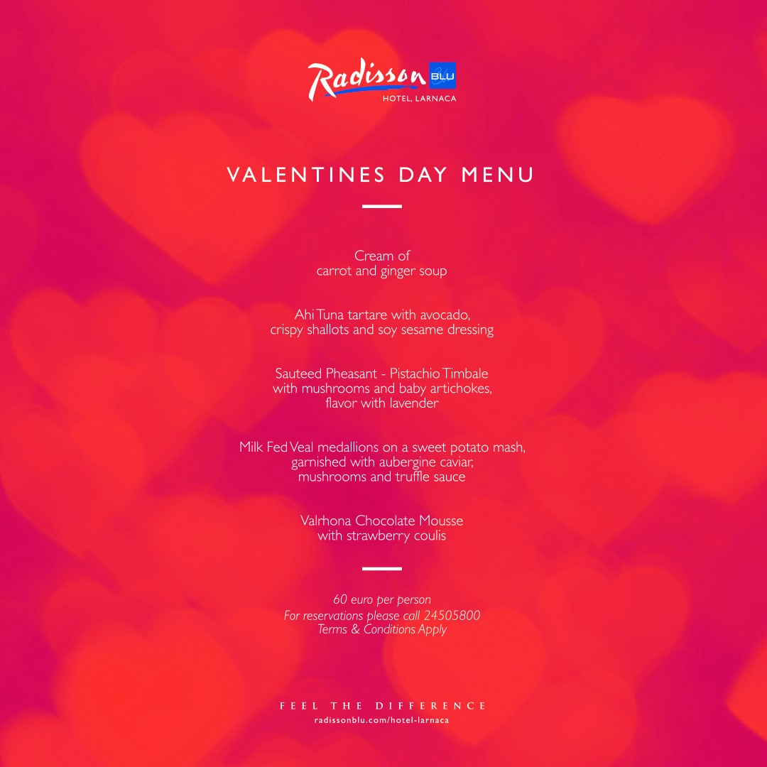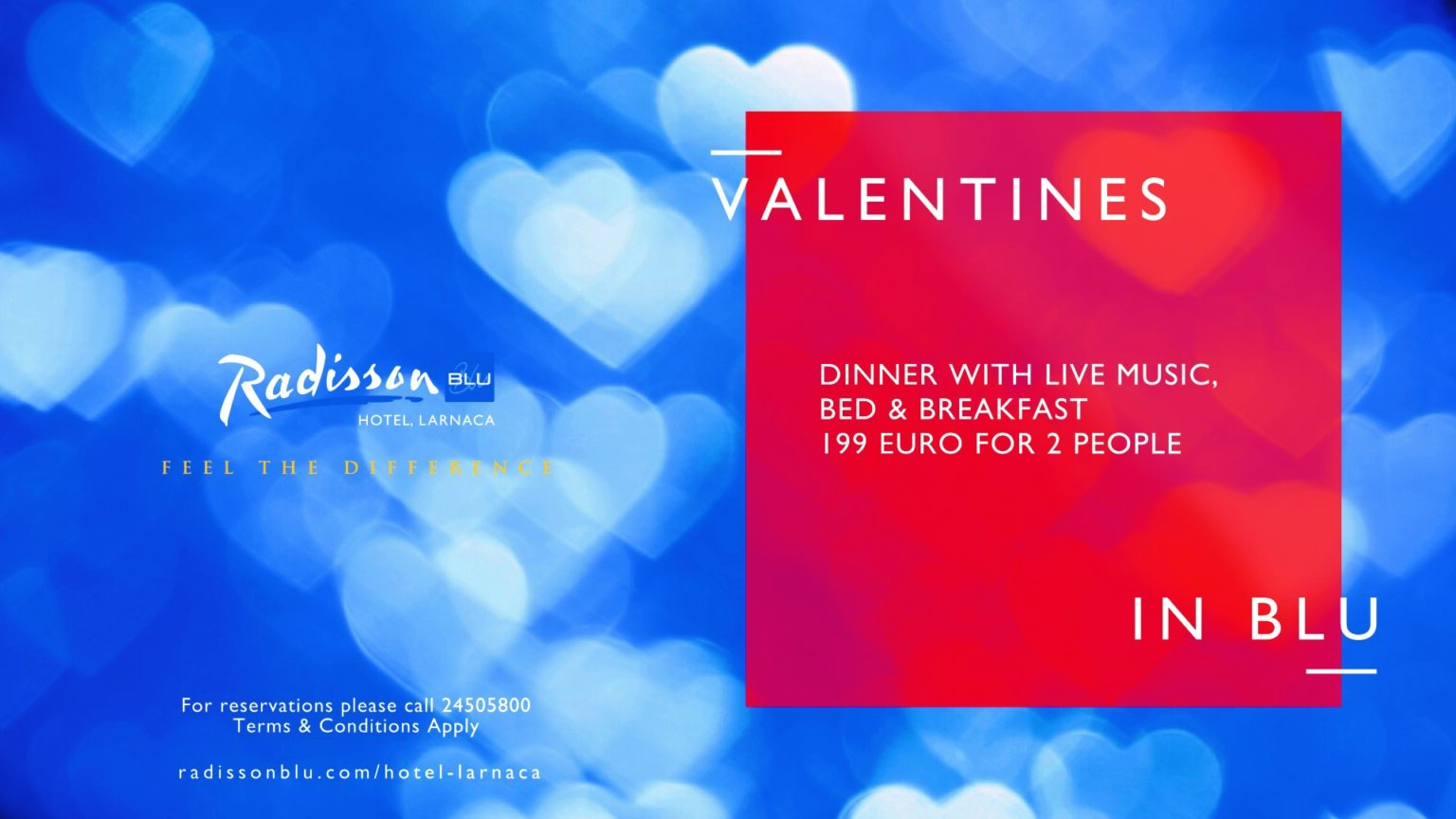 Περιλαμβάνει 5 course set menu δείπνο, που επιμελήθηκε ο σεφ του Radisson Blu Hotel, Larnaca Γιώργος Ζορλάκης με ζωντανή μουσική και ποτό καλωσορίσματος, διανυκτέρευση και πρωινό στο κρεβάτι στην ειδική τιμή των €199 για δύο άτομα.