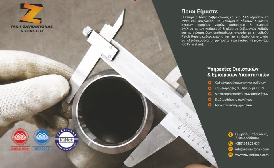 Η εταιρεία Τάκης Ζαβράντωνας και Υιοί ΛΤΔ, ιδρύθηκε το 1999 και ασχολείται με καθάρισμα λάκκων λυμάτων, οχετών ομβρίων νερών, καθάρισμα – πλύσιμο αντλιοστασίων, καθαρισμό-πλύσιμο δεξαμενών λαδιών και πετρελαιοειδών, επιδιόρθωση αγωγών με τη μέθοδο Patch Repair, καθώς επίσης και την επιθεώρηση αγωγών με εξειδικευμένα μηχανήματα τελευταίας τεχνολογίας (CCTV system).