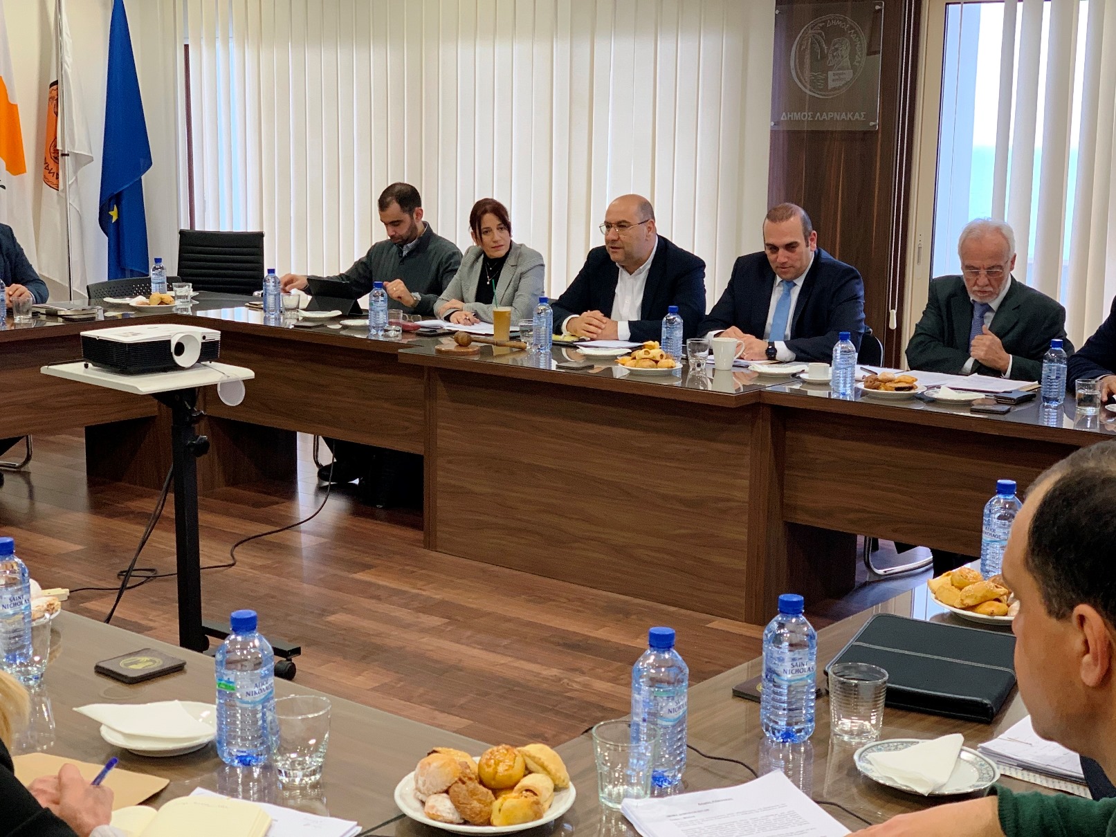 Ακολούθησε συνεδρίαση με τον Υπουργό, για συζήτηση διαφόρων θεμάτων που αφορούν την πόλη της Λαρνακας κατά την οποία συμμετείχαν ο Δήμαρχο Λάρνακας, Βουλευτές Λάρνακας, Επικεφαλείς των Δημοτικών Ομάδων Δήμου Λάρνακας καθώς επίσης και Υπηρεσιακοί Λειτουργοί του Υπουργείου και του Δήμου Λαρνακας.
