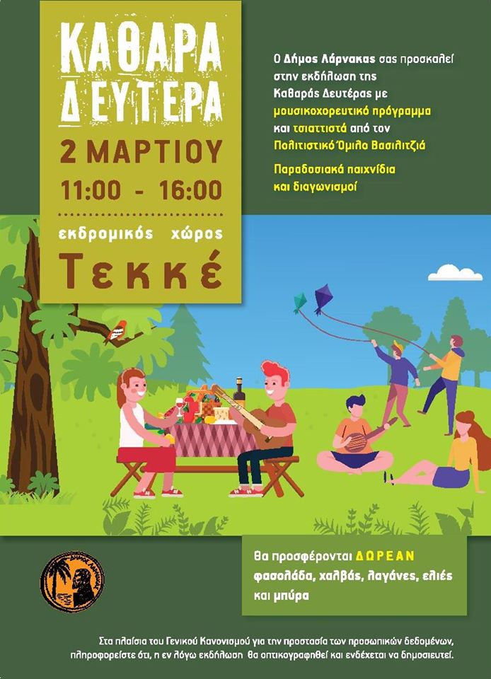 Στον Εκδρομικό Χώρο Τεκκέ θα γιορτάσει για άλλη μια χρονιά τη  Καθαρά Δευτέρα ο Δήμος Λάρνακας με μουσικοχορευτικό πρόγραμμα και τσιατιστά από τον Πολιτιστικό Όμιλο Βασιλιτζιά.