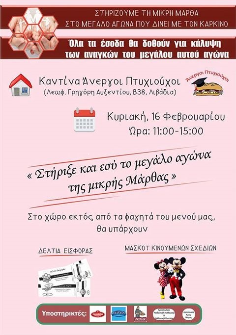 Η Καντίνα Άνεργοι Πτυχιούχοι, διοργανώνει την Κυριακή 16 Φεβρουαρίου 2020 από τις 11.00 το πρωί μέχρι και τις 3.00 μ. μ. φιλανθρωπική εκδήλωση για την μικρή Μάρθα που πάσχει από μια σπάνια μορφή καρκίνου και πρέπει να μεταβεί άμεσα στο εξωτερικό για θεραπεία.