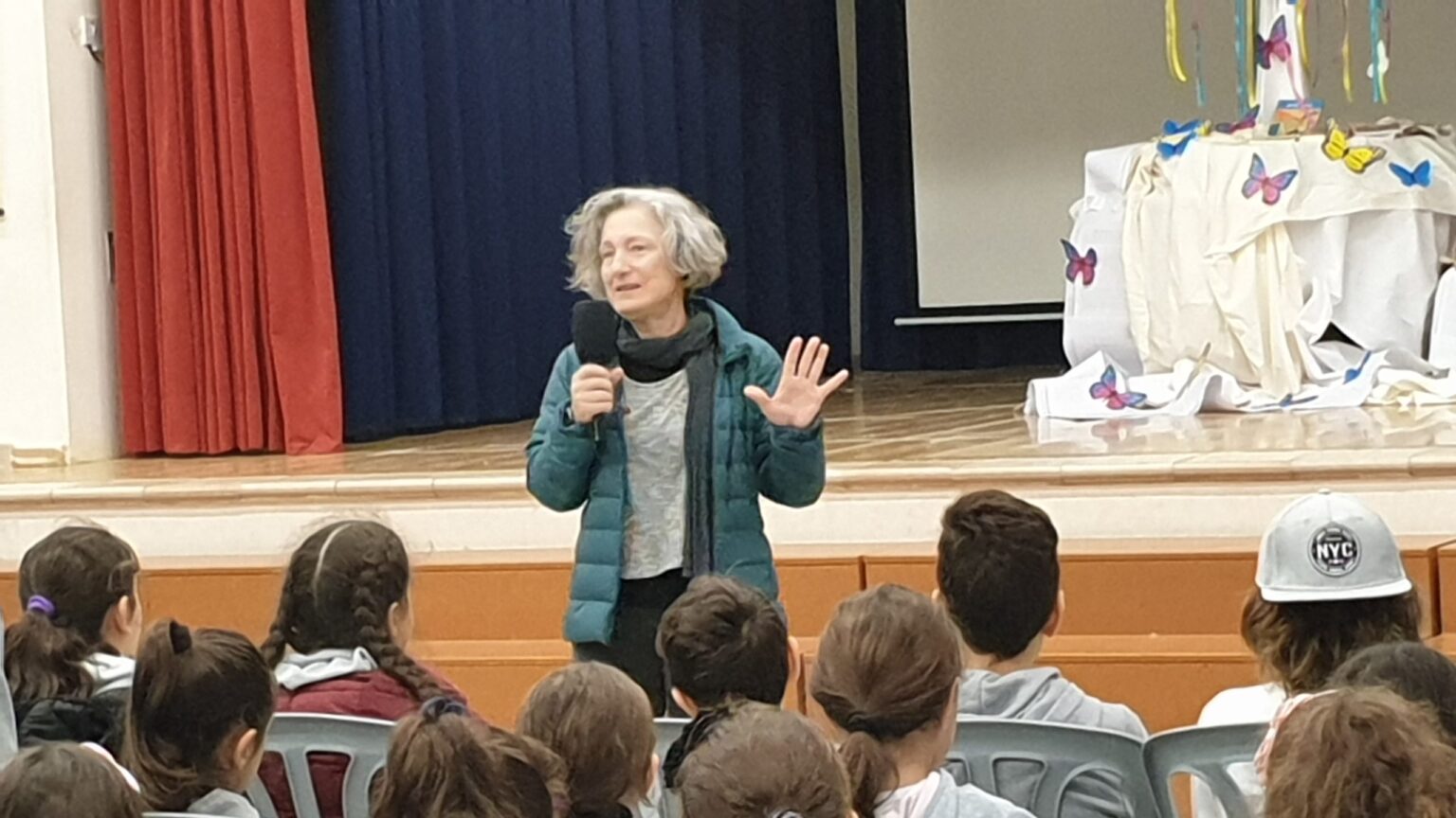 Την Τετάρτη 19 Φεβρουαρίου τα παιδιά υποδέχτηκαν στο Σχολείο την κ. Αγγελίδου με απαγγελία της Αλφαβήτας και χορευτικό δρώμενο από τα παιδιά της Στ’ τάξης. Ακολούθησαν δύο ογδοντάλεπτα εργαστήρια, ένα με τα παιδιά των Δ’ τάξεων κι ένα με τα παιδιά των Ε’ τάξεων. Την επόμενη μέρα σειρά είχαν τα παιδιά των Στ’ τάξεων να ακούσουν την κ. Αγγελιδου.