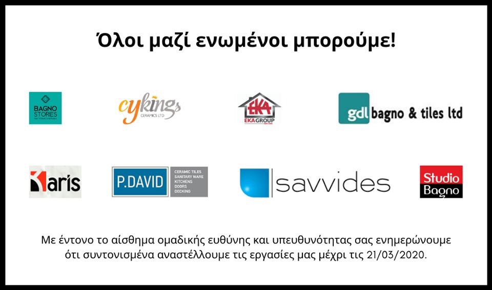 Τα καταστήματα ειδών υγιεινής και κεραμικών της Λάρνακας, Bagnostories, Cykings Ceramics Ltd, EKA Group, GDL Hadjimatheou Bathroom Center, KARIS Trading, P.David, Savvides και Studio Bagno Group, ενώνουν τις δυνάμεις τους ενάντια του COVID-19, ως ένδειξη σεβασμού τόσο στους πελάτες όσο και στα στελέχη τους.