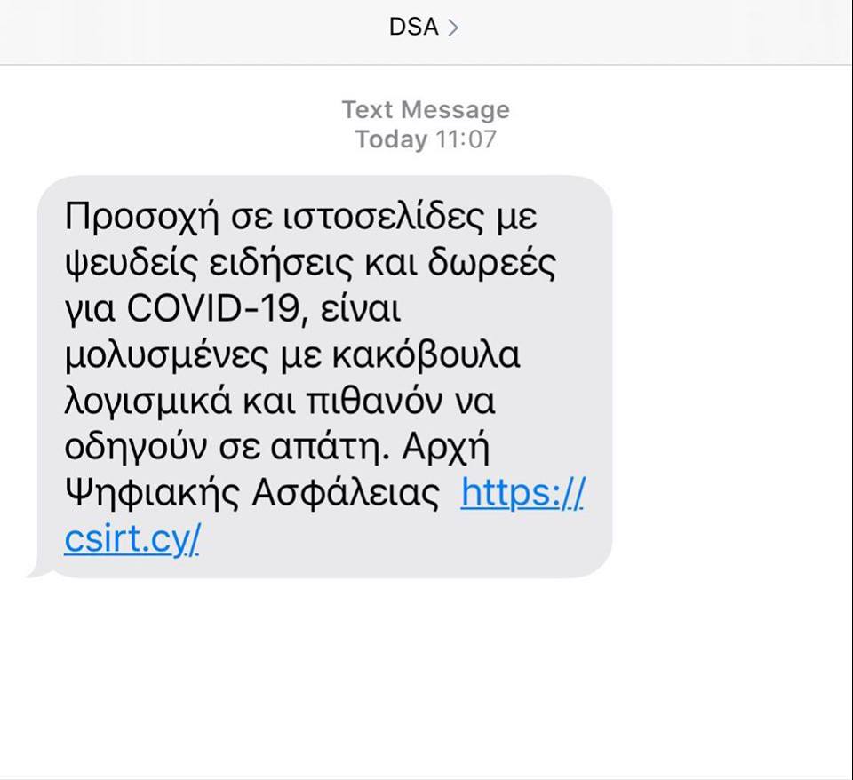 Σε μήνυμα που στάλθηκε σε αρκετά κινητά τηλέφωνα, η Αρχή καλεί τον κόσμο να είναι προσεχτικός σε ιστοσελίδες με ψευδείς ειδήσεις και δωρεές για τον COVID-19, οι οποίες είναι «μολυσμένες με κακόβουλα λογισμικά και πιθανόν να οδηγούν σε απάτη.