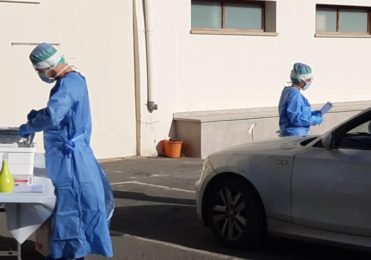 Κάτοικοι κατόπιν τηλεφωνικού ραντεβού προσέρχονται με τα οχήματά τους για να υποβληθούν στην εξέταση για τον κορωνοϊό. Δύο νοσηλευτές του Υπουργείου Υγείας με στολές και μάσκες, λαμβάνουν δείγμα από τους προσερχόμενους οι οποίοι δεν αποβιβάζονται από τα οχήματά τους. Στο χώρο στάθμευσης προσέρχονται όμως και πεζοί.