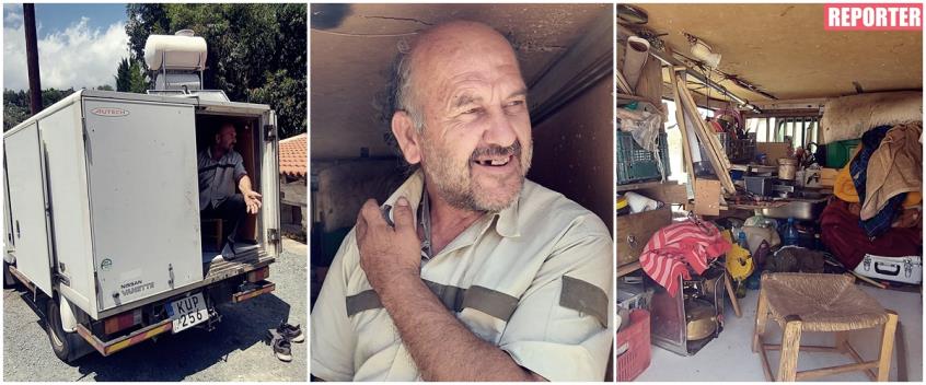 Με βάση αυτήν την πληροφορία που ήρθε στη δημοσιογραφική ομάδα του REPORTER, ψάξαμε να τον βρούμε. Δεν ήταν δύσκολο, αφού το σπίτι-αυτοκίνητό του, εκτός από τις σπάνιες φορές που πάει για δουλειές στην πόλη, είναι μονίμως σταθμευμένο δίπλα από την εκκλησία, της Παναγιάς, στο χωριό Λάγια της Επαρχίας Λάρνακας. Κι αυτό επειδή εδώ και πολλούς μήνες, φιλοτεχνεί τις αγιογραφίες του Ναού.