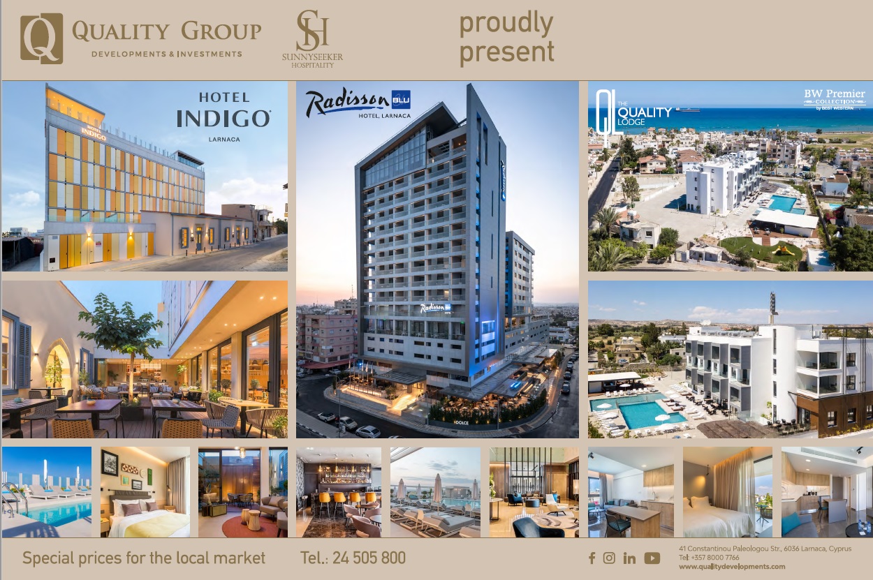 Αυτά τα ξενοδοχεία είναι προϊόντα αφοσίωσης, προσπάθειας, σχεδιασμού και έμπνευσης. Ταυτόχρονα βρίσκεται σε εξέλιξη η κατασκευή άλλων έργων της ξενοδοχειακής βιομηχανίας και όχι μόνο για τα οποία θα έχουμε σύντομα ανακοινώσεις. Θα ήταν παράλειψη να μην σημειώσω ότι αριθμός άλλων έργων είναι στο στάδιο του τελικού σχεδιασμού. Είναι τεράστιας σημασίας και προτεραιότητας για τον Όμιλο μας να συνεχίσει με την υλοποίηση των στόχων του. Συνεχίζοντας νοιώθω την ανάγκη να αναδείξω ένα σημείο που για τον Όμιλο της Quality είναι υψίστης σημασίας και προτεραιότητας, είναι σπουδαίο που κρατάμε μεγάλο αριθμό θέσεων εργασίας ανοικτό. Νοιώθουμε υπέροχα που μπορούμε να συμβάλουμε και με αυτό τον τρόπο στην οικονομία της Λάρνακας ειδικά και της Κύπρου γενικότερα. Θέλουμε όπου και όπως κινούμαστε να μεθοδεύουμε με  θετικό κλίμα, να εκπέμπουμε αισιοδοξία και να δημιουργούμε ευημερία για τους ανθρώπους μας, το προσωπικό μας και τον τεράστιο αριθμό των συνεργατών μας που κινούνται μέσα και γύρω από τον Όμιλο μας. Ακριβώς στα πλαίσια αυτής της φιλοσοφίας που υπηρετούμε ως Όμιλος είναι που πήραμε τις τολμηρές αποφάσεις για να επαναλειτουργήσουμε το Radisson Blu Hotel, Larnaca, τα εστιατόρια Ma και Marbre αλλά και να αρχίσουμε λειτουργία του Indigo Hotel Larnaca και του The Quality Lodge, BW Premier Collection by Best Western”.