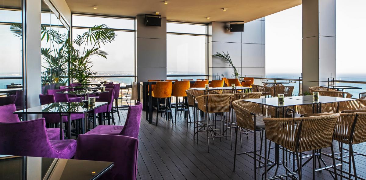 Ένα ατμοσφαιρικό roof bar στον 16ο όροφο του ξενοδοχείου Radisson Blu που συνδυάζει κομψότητα και αίγλη με θέα την υπέροχη Λάρνακα. Ένα περιβάλλον με υψηλή αισθητική, όμορφη διακόσμηση με ψηλά και χαμηλά τραπέζια, άνετες καρέκλες και ωραίο επιβλητικό μπαρ.