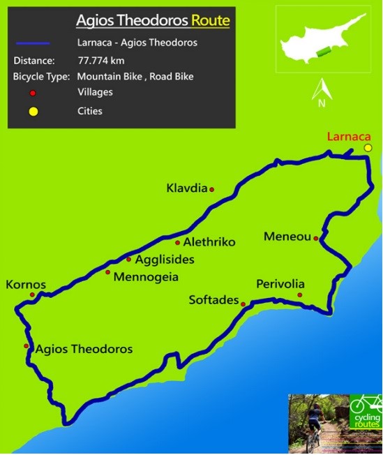 Η Κοινότητα μας περιλαμβάνεται στη διαδρομή «Λάρνακα – Άγιος Θεόδωρος», η οποία είναι συνολικής απόστασης 77.7km χιλιομέτρων