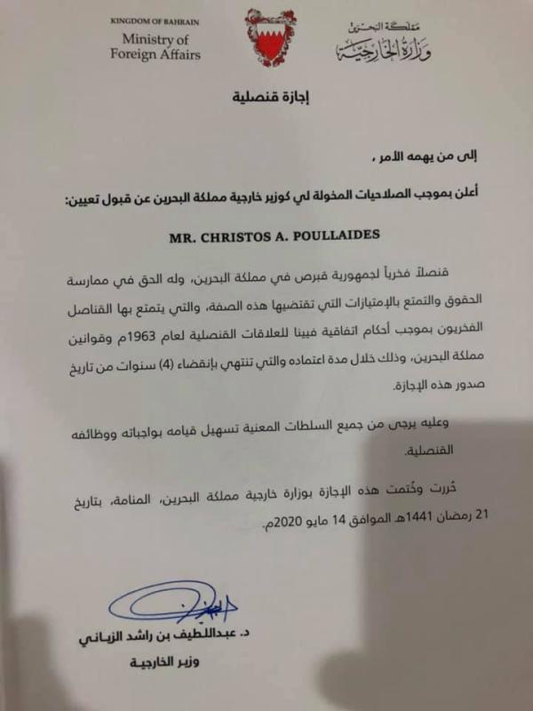 Και επίσημα Επίτιμος Πρόξενος στο βασίλειο του Μπαχρέιν ο Χρίστος Πουλλαϊδης