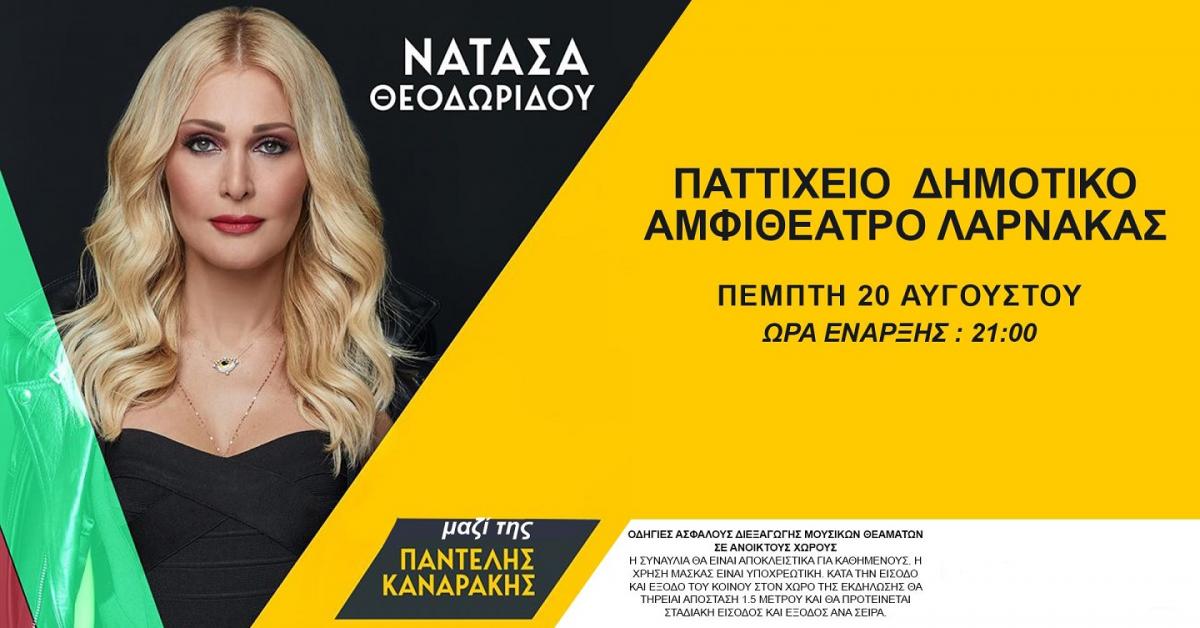 Νατασα Θεοδωρίδου την Τετάρτη 19 Αυγούστου στο Κηποθέατρο Λεμεσού και την Πέμπτη 20 Αυγούστου στο Παττίχειο Αμφιθέατρο Λάρνακας.