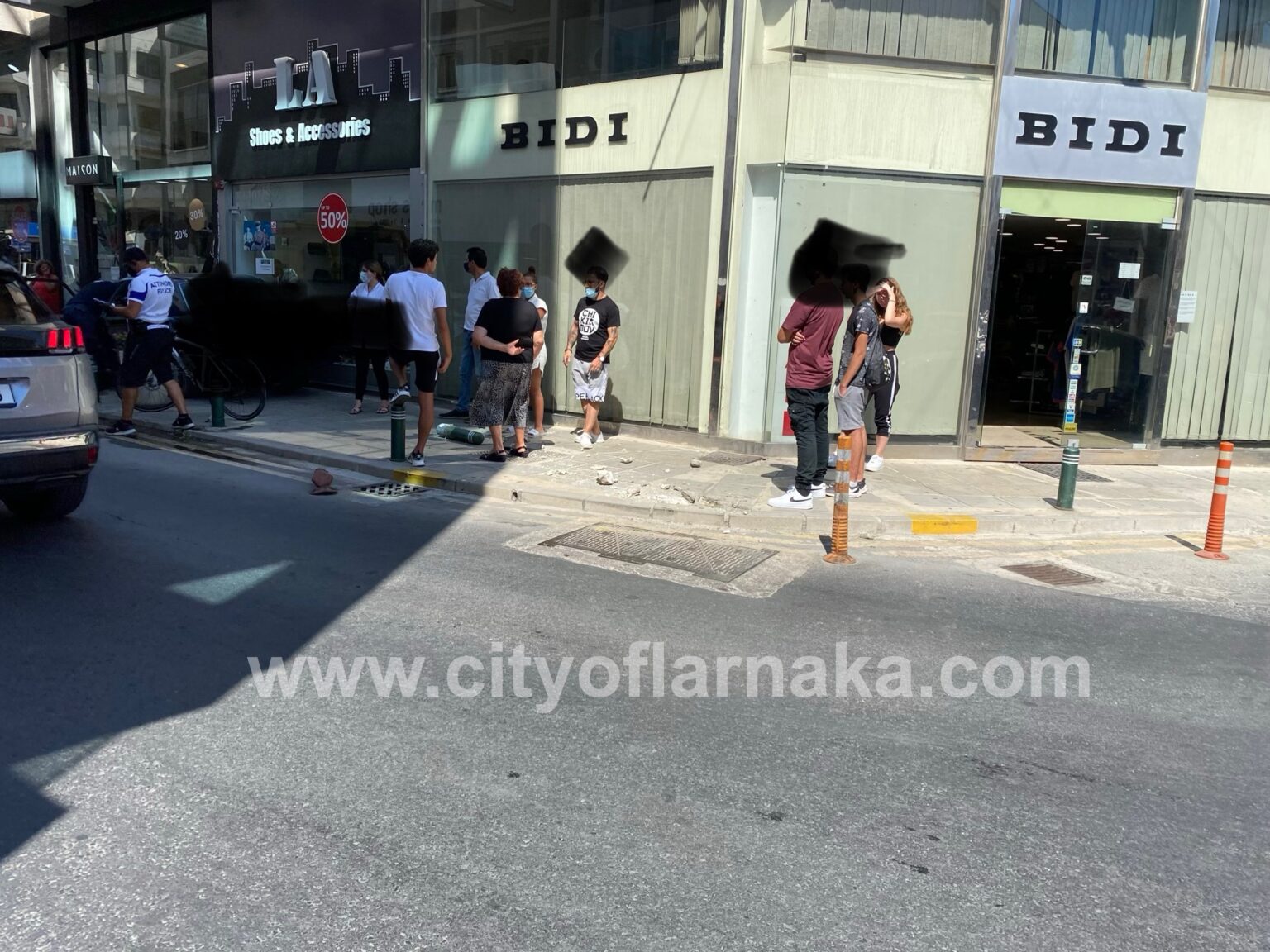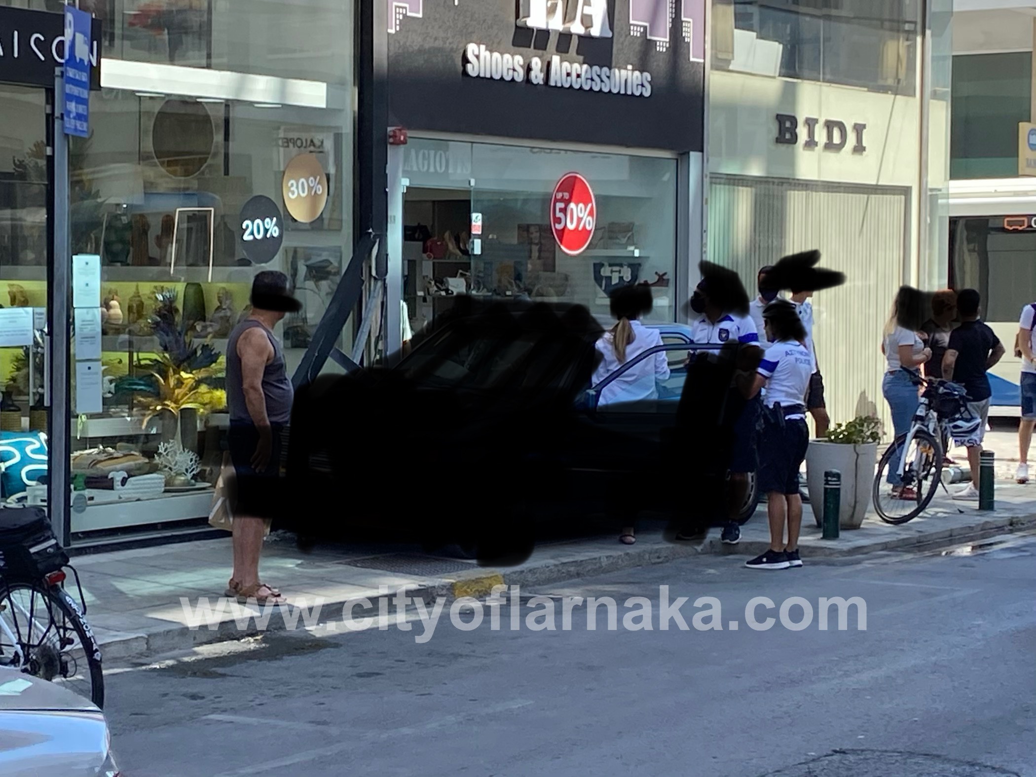 Ήταν γύρω στις 14:40 όταν λήφθηκε η πληροφορία στην Αστυνομία για όχημα το οποίο βγήκε εκτός δρόμου, ανέβηκε σε πεζοδρόμιο και βιτρίνα καταστήματος στην οδό Ζήνωνος Κιτιεύς.